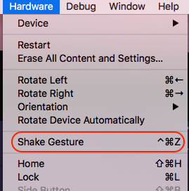 - 두번째 방법 : iOS 시뮬레이터 Hardware menu에서 "Shake Gesture" 클릭
